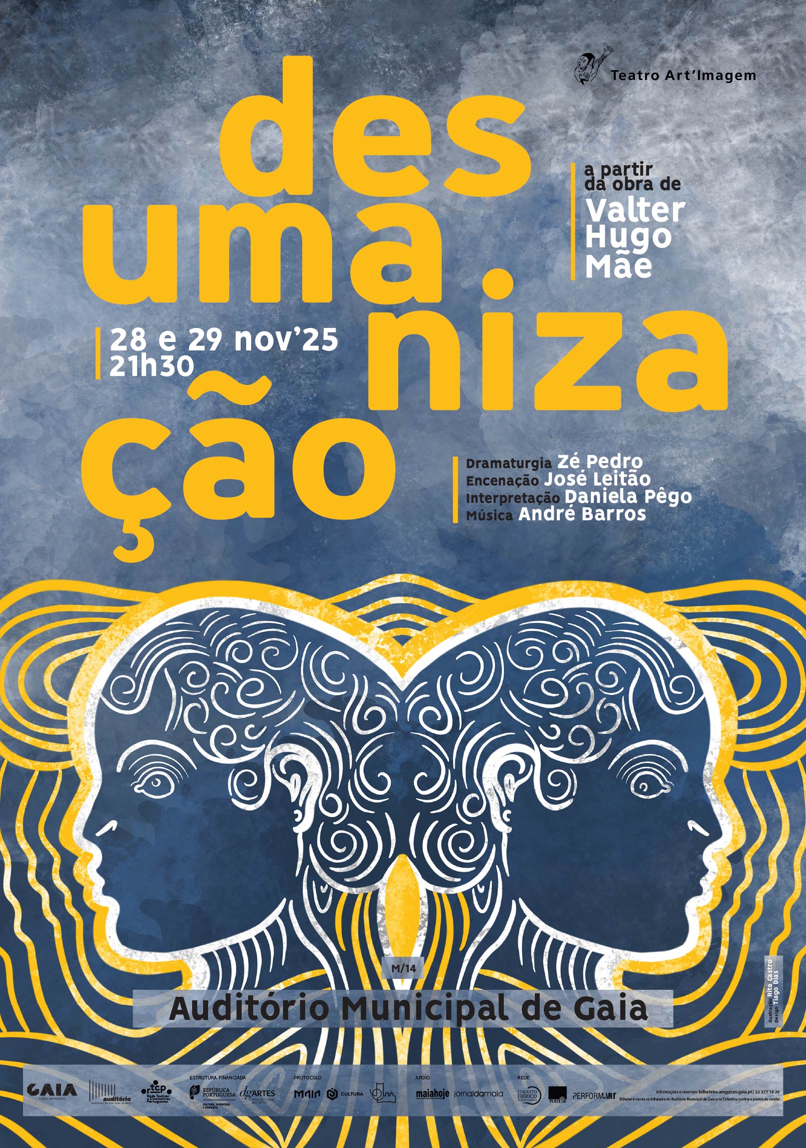 A Teatro Art’Imagem apresenta "Desumanização”, uma versão cénica do romance "A Desumanização”, do consagrado escritor português Valter Hugo Mãe, prémio literário José Saramago, numa dramaturgia de José Pedro Pereira, com direção e encenação de José Leitão, fundador e diretor da companhia. Esta é uma história de perda, luto e superação que nos faz questionar acerca dos limites (ou sua transgressão) da humanidade. Numa pequena aldeia abafada pela monumentalidade dos fiordes islandeses, Halldora surge em cena a partir da boca de Deus para nos contar como foi lidar com a morte de Sigridur, sua irmã gémea. Como preencher a metade que se perdeu? Como viver pelas duas? Como ocupar o outro lado do espelho? Halldora diz-nos que "O mundo mostrava a beleza, mas só sabia produzir o horror”. "Desumanização” é Gelo, Terra e Fogo; é o "corpo interior da Islândia”. Esta obra é, segundo o autor, um autêntico cântico de amor à Islândia. A encenação, tal como a obra, vai à Islândia buscar referências para a sua ficção teatral, num olhar "estrangeiro” sobre um país e suas gentes e numa visão artística que confronta os vários olhares de que é feita a vida, entre o real e imaginário. M/14.